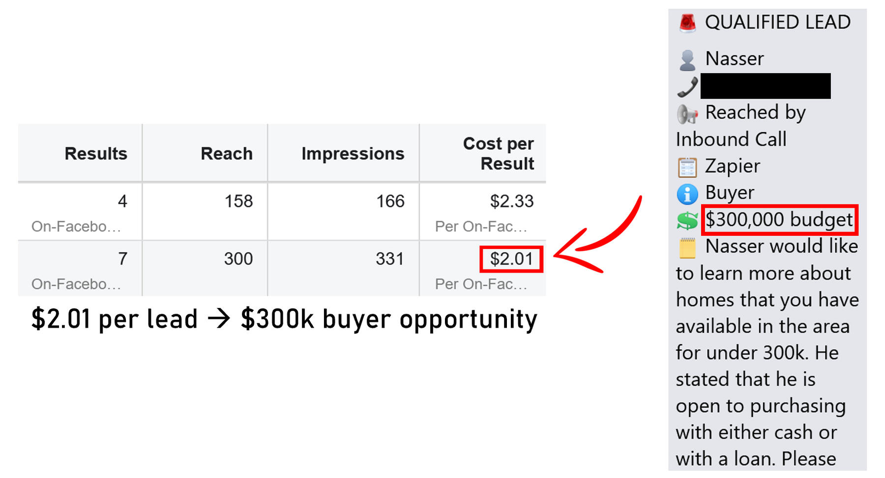 Let's say you generate 100 leads at $5 per lead, meaning you spent $500 in total for lead generation.Let's also assume an average home value of $300k.Your commission rate as the buyer agent is 3%.The average lead conversion rate from this system is 2 - 12%, but we'll call it 2% for this example.At 100 leads, a 2% conversion rate means 2 leads turned into clients.If each of them buys a home worth $300k, that earns you $18,000 in commission.And you only spent $500.Now, let's cut your conversion rate in half...Only 1 lead converts.You still earned $9,000 in commission.Now, just for fun, let's double the cost and cut the commission in half.Even in this situation, you still made $4,500 in commission and only spent $1,000.But wait.What if half of the leads that convert also refer you?What if the home value is greater than $300k?What if the conversion rate is greater than 2%?You get the idea...Now, what if we also automate all of the manual processes you have to deal with on a daily basis?What if you get 25% of that time back?What if you get 50% back?Not only are you generating quality leads on autopilot, but you have more time to work with those clients and sell more homes every month.