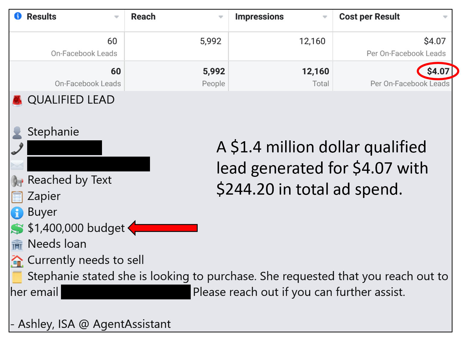 Adam spent $244.20 to produce a qualified lead with a $1.4m budget looking to sell her luxury property and purchase a new one.